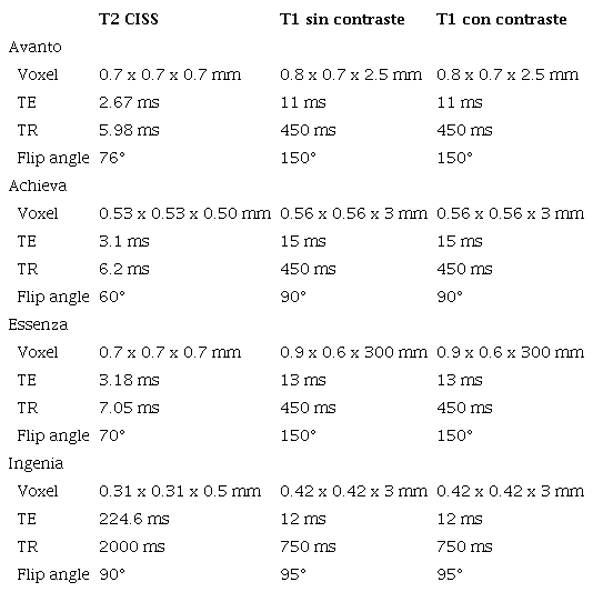 Secuencia T2 AR: los equipos marca Siemens (Avanto y Essenza) utilizan secuencia de gradiente CISS volumétrica (3D), y los equipos marca Philips (Achieva e Ingenia) utilizan secuencia de gradiente Balance FFE 3D.