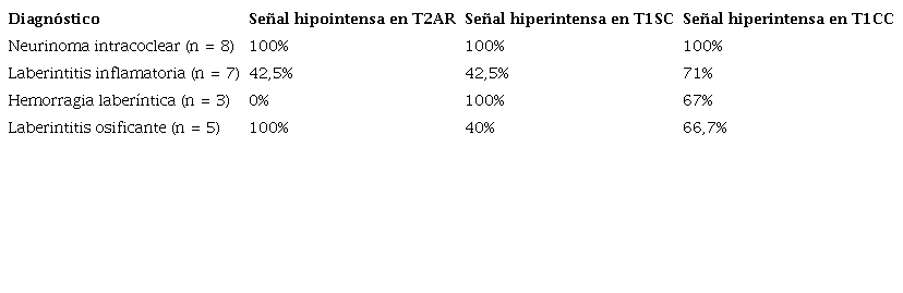 Resultados: Se analizaron las imágenes de RM de 23 pacientes con una mediana de edad de 60 años (rango: 43-73). Encontramos 8 (34,8%) pacientes con neurinoma intralaberíntico, 7 (30,4%) con laberintitis inflamatoria, 5 (21,7%) con laberintitis osificante y 3 (13%) con hemorragia intralaberíntica. Todos los pacientes con neurinoma intralaberíntico tenían una baja señal en la secuencias T2 AR, ligera hiperseñal en las secuencias T1 SC y realce poscontraste. Tres pacientes (42,5%) con laberintitis inflamatoria tenían baja señal en las secuencias T2 AR y 5 (71%) tenían realce en las secuencias T1 CC. Los pacientes con laberintitis osificante tenían una baja señal en las secuencias T2 AR y los pacientes con hemorragia tenían una señal alta en las secuencias T1 SC. Los pacientes con neurinoma intralaberíntico tenían señal más baja en T2 AR que los pacientes con laberintitis inflamatoria (p = 0,026).