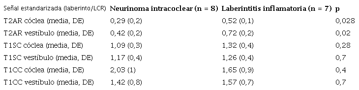 Como objetivo secundario, nos planteamos la utilidad de la secuencia T2 AR en la comparación entre pacientes con neurinomas intralaberínticos y laberintitis inflamatoria, debido a que son dos de las afecciones intralaberínticas más frecuentes y que además en ellas se pueden superponer los hallazgos de RM. En la evaluación de pacientes con ambas afecciones encontramos una señal más baja en la secuencia en T2 AR en el neurinoma intralaberíntico como única variable estadísticamente significativa.