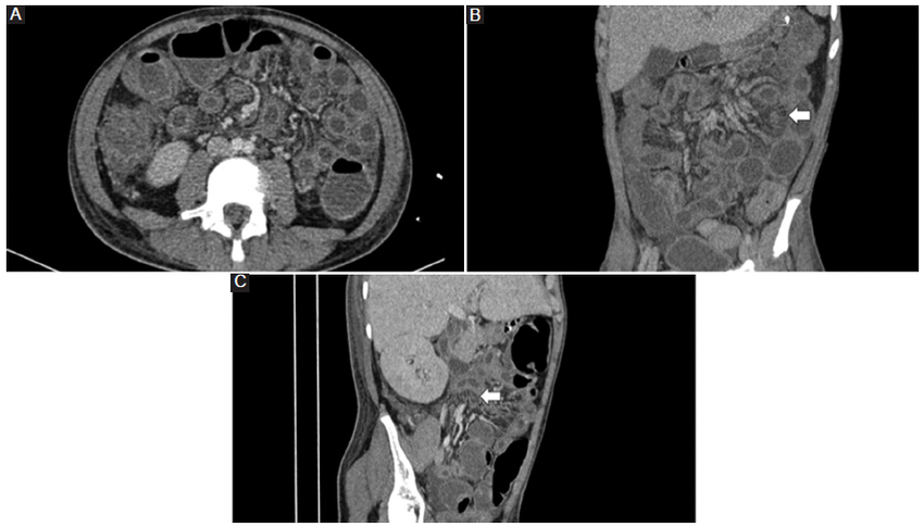 Aunque inicialmente el signo fue descrito en la EC, no se considera patognomónico de esta y ya ha sido observado en muchos otros procesos que afectan los vasos mesentéricos, incluyendo vasculitis por lupus u otras vasculitis como la poliarteritis nudosa, la púrpura de Schönlein-Henoch, el síndrome de Behçet, y en patologías como la tromboembolia mesentérica, la obstrucción intestinal y la colitis ulcerativa3,4.
