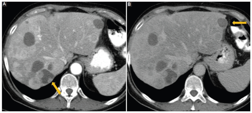 Más comúnmente, el cambio quístico es el resultado de una terapia previa como la TACE o la ablación por radiofrecuencia, siendo clave la historia clínica en estos casos41,42,43.