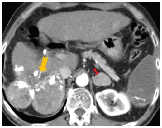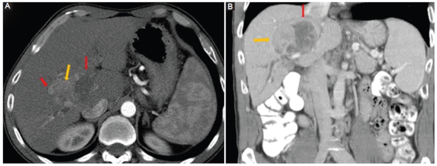 La ictericia obstructiva causada por el HCC, especialmente como presentación inicial, es un evento raro (1-12%). Se lo conoce como «hepatoma tipo ictérico» o «tipo colestásico» y su pronóstico es sombrío, con altas tasas de recurrencia posterior a la resección. Puede suceder por invasión directa del HCC (focal o difuso) o trombos tumorales que comprometen el árbol biliar. En otras ocasiones puede relacionarse con sangrados tumorales con hemobilia o compresión extrínseca de la vía biliar por la lesión. Por un mecanismo poco claro luego de una TACE podría aumentar la posibilidad de invasión biliar45,51.