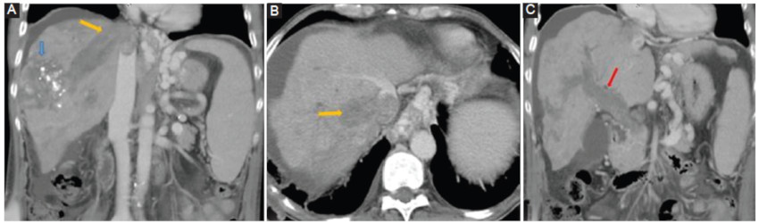 Las venas hepáticas son invadidas con menos frecuencia en hasta un 12 a 54%, pudiendo en raras ocasiones propagarse a la vena cava inferior (Fig. 14). Raramente, puede extenderse hacia la aurícula derecha51.