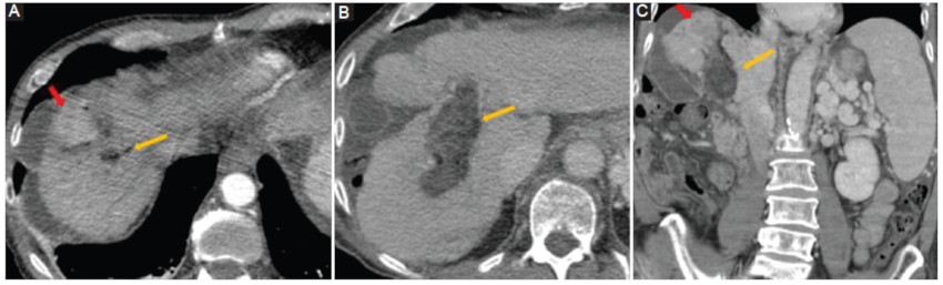 La invasión extrahepática por contigüidad hacia la cavidad abdominal, el retroperitoneo o el tórax adyacente es un hallazgo inusual en los estudios de imágenes, siendo las estructuras más afectadas el diafragma, la vesícula y el omento52. La invasión del tracto gastrointestinal es muy poco frecuente, comprometiendo el estómago, duodeno, colon y yeyuno. En estos casos, el paciente puede iniciar con una hemorragia digestiva o una fístula hepatodigestiva (Fig. 17) (52,53.