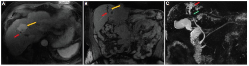 La TC y la RM sugieren el diagnóstico cuando evidenciamos una masa de tejidos blandos en los conductos biliares o un nódulo con el patrón típico de hiperrealce en fase arterial y lavado posterior asociados a dilatación ductal proximal a la obstrucción en un paciente cirrótico (Fig. 16).