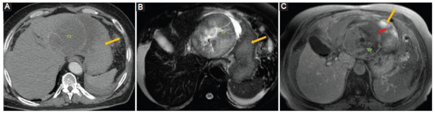 El diagnóstico de un HCC-CC debe ser considerado cuando existen marcadores tumorales elevados de ambas entidades (AFP y CA19-9) y la lesión presenta características de imagen dinámicas con contraste en RM y TC, coexistentes de los dos tumores con sectores de realce arterial y lavado portal combinado con sectores de realce progresivo y tardío (Fig. 12). Se los clasifica en: tipo A (coexisten separadamente), tipo B (coexisten contiguamente, pero independientes) y tipo C (coexisten mezclados en una misma masa) (16.