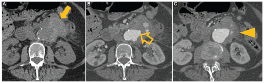 Aneurisma micótico (infeccioso). Hombre de 75 años con antecedentes de hipertensión y diabetes. Fiebre y dolor abdominal de dos semanas de evolución. TC con contraste en cortes axiales. A: fase sin contraste. B y C: fase arterial. Se observa un tejido con densidad de partes blandas periaórtico (flecha) adyacente a una pequeña saliente de perfil (flecha hueca) en la pared lateral izquierda de la aorta con inflamación de los tejidos blandos periaórticos (punta de flecha).