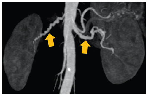 Displasia fibromuscular. Mujer de 28 años con hipertensión arterial de diagnóstico reciente. TC de abdomen y pelvis con contraste fase angiográfica reconstrucción coronal con máxima intensidad de proyección. Las arterias renales presentan zonas dilatadas y estenóticas que determinan una configuración arrosariada.