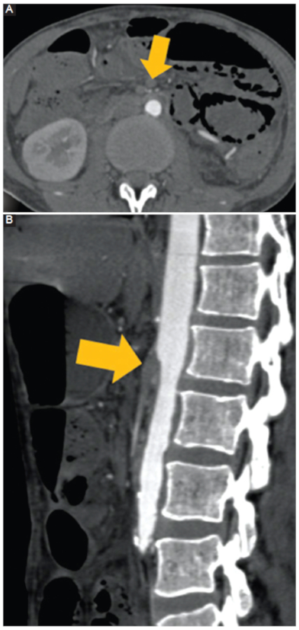 Enfermedad arterial inducida por radiación. Hombre de 40 años con antecedente de cáncer testicular a los 20 años, tratado con radioterapia y cirugía. TC con contraste. A: corte axial en fase arterial. B: corte sagital en fase arterial. Se observa un trombo oclusivo de la arteria mesentérica superior desde su origen (flecha).