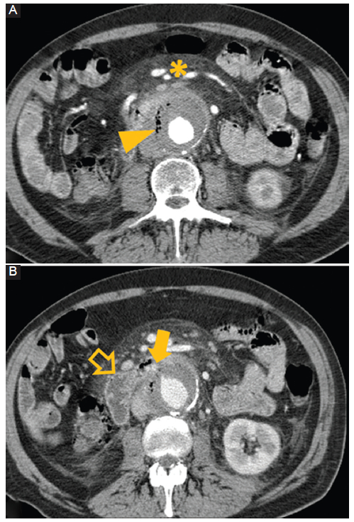 Fístula aorto-entérica. Mujer de 58 años. Dolor abdominal y sangrado gastrointestinal. TC con contraste cortes axiales A y B: el estudio muestra un aneurisma aórtico abdominal con comunicación y paso de medio de contraste (flecha) hacia el duodeno (flecha hueca). También hay presencia de gas en un trombo mural (punta de flecha) y cambios inflamatorios en los tejidos adyacentes (asterisco).