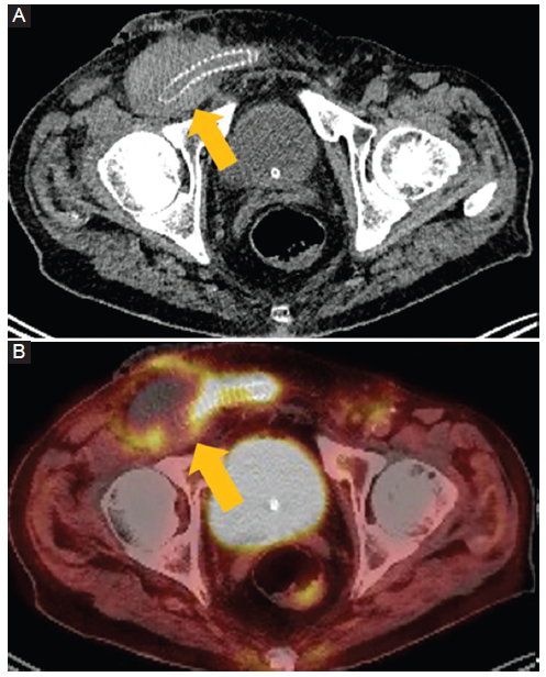 Injertos arteriales infectados. Hombre de 90 años con antecedentes de injerto aorto-bifemoral. TC con emisión de positrones de cuerpo entero con 18fluorodesoxiglucosa (FDG). A: corte axial fase porto-venosa. B: corte axial fusión. Las imágenes demuestran cambios de atenuación del tejido adyacente al injerto femoral derecho (flecha), con una mayor captación de FDG (SUV máx. 7,9).