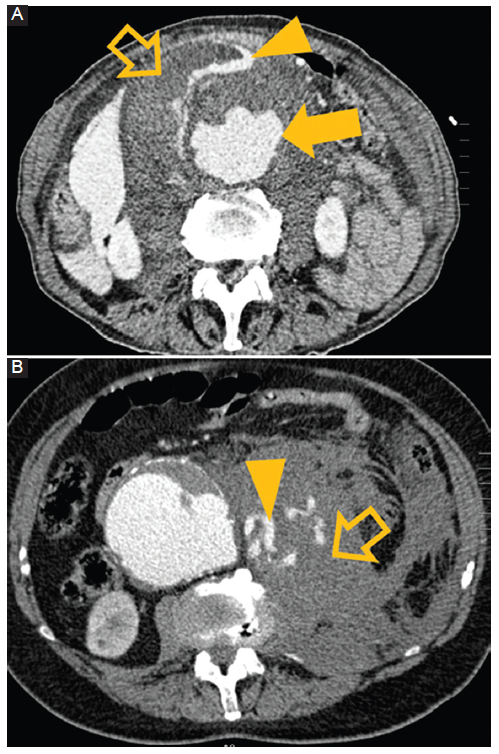 Rotura de un aneurisma. Hombre de 62 años. Dolor abdominal e hipotensión. TC con contraste cortes axiales A y B: se observa un aneurisma aórtico abdominal roto (flecha) con un extenso hematoma retroperitoneal (flecha hueca) y hemorragia activa demostrada por extravasación del medio de contraste (punta de flecha).
