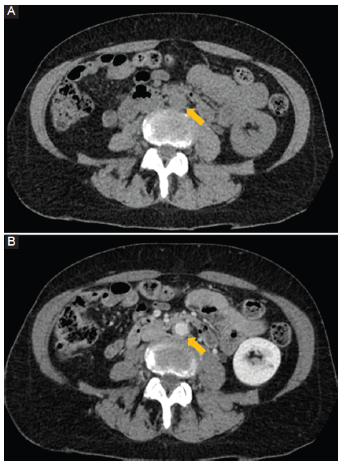 Arteritis de células gigantes. Hombre de 69 años. Dolor abdominal. TC con contraste cortes axiales. A: fase sin contraste. B: fase porto-venosa. Se observa leve engrosamiento de la pared aórtica con un tejido con densidad de partes blandas que la rodea circunferencialmente (flecha).