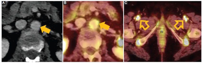 Arteritis de células gigantes. Hombre de 70 años. Control oncológico. TC con emisión de positrones18 fluorodesoxiglucosa A: corte axial fase porto-venosa. B: corte axial fusión. Aumento en la captación del radiotrazador en la aorta abdominal sin observar engrosamiento parietal aórtico (flecha) (SUV máx. 5,5). C: corte axial fusión. Aumento significativo en la captación del radiotrazador en las arterias femorales comunes (flecha hueca).
