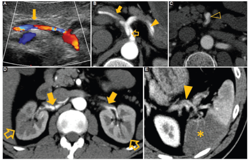 Mediólisis arterial segmentaria. Hombre de 38 años con pancreatitis aguda. A: la ecografía muestra un diámetro aumentado de la arteria hepática común y esplénica con material ecogénico que ocupa parcialmente el lumen (flecha). B: TC con contraste corte axial. Se identifica una estenosis secundaria a un trombo en la arteria hepática (flecha) asociado a colgajos de disección en el tronco celíaco (flecha hueca) y la arteria esplénica (cabeza de flecha). C: TC con contraste corte axial. Disección de la arteria mesentérica superior (cabeza de flecha hueca). D: TC con contraste corte axial. Estenosis, disección y presencia de trombos en ambas arterias renales (flecha) asociado a defectos de perfusión (flechas huecas). E: TC con contraste corte axial. Disección de la arteria esplénica (punta de flecha) con un defecto de perfusión (asterisco).