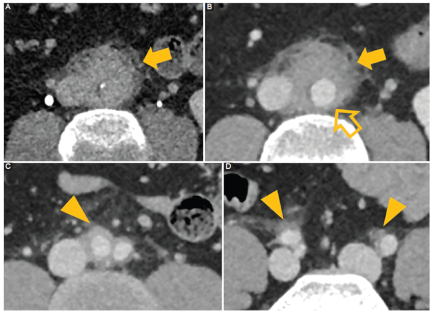Fibrosis retroperitoneal. Hombre de 42 años con dolor abdominal. TC con contraste, cortes axiales. A: fase sin contraste. B-D: fase porto-venosa. Engrosamiento inflamatorio con densidad de tejido de partes blandas de contornos irregulares que rodea la cara anterolateral de la aorta abdominal infrarrenal (flecha), sin comprometer su pared posterior (flecha hueca). Este tejido realza con el contraste y se asocia a cambios inflamatorios del tejido adiposo adyacente. C y D: se observa extensión de este tejido a ambas arterias ilíacas comunes (punta de flecha).