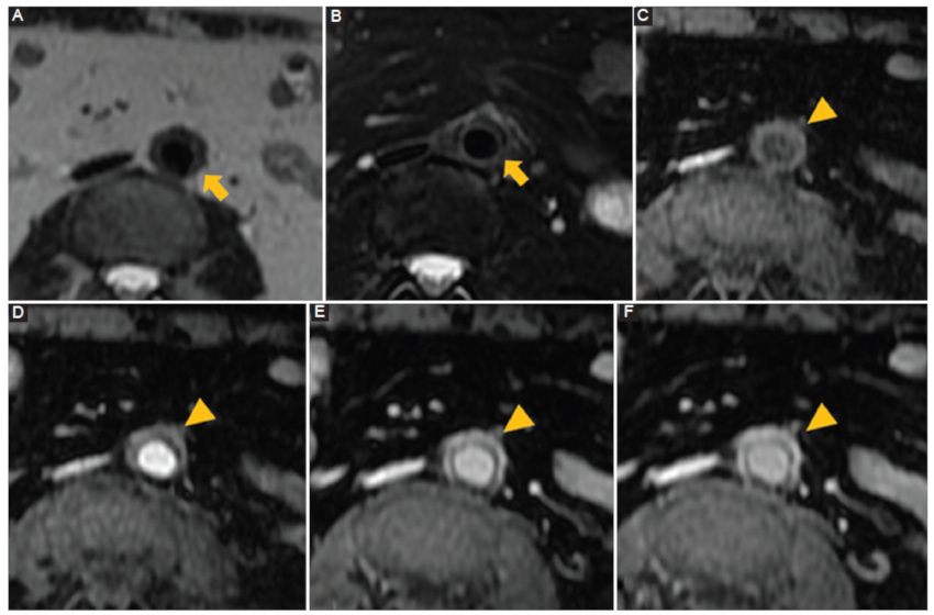 Fibrosis retroperitoneal. Hombre de 69 años. Sospecha de diverticulitis aguda. Resonancia magnética con contraste A: secuencia ponderada en T2 corte axial. B: secuencia ponderada en T2 con saturación grasa corte axial. El tejido periaórtico es hipointenso en las secuencias ponderadas en T2 y T2 con saturación grasa (flecha). C: secuencia ponderada en T1 precontraste con saturación grasa corte axial. D: secuencia ponderada en T1 fase arterial con saturación grasa corte axial. E: secuencia ponderada en T1 fase porto-venosa con saturación grasa corte axial. F: secuencia ponderada en T1 fase tardía con saturación grasa corte axial. Después de la inyección de contraste intravenoso paramagnético (gadolinio) se observa un realce progresivo del tejido de partes blandas periaórtico (punta de flecha).