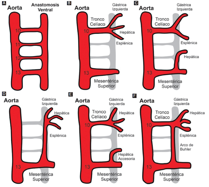 El tronco celíaco-mesentérico se forma cuando las arterias vitelinas 10.a a 12.a se retraen y gran parte de la anastomosis ventral persiste para conectar la arteria celíaca y las ramas a la AMS (Fig. 1 D). Una arteria hepática parcialmente reemplazada o accesoria se forma de manera similar a una arteria hepática completamente reemplazada, debido a que no retrocede una porción de la anastomosis ventral (Fig. 1 E). El arco de Bühler resulta de la persistencia de la anastomosis ventral, que conecta el tronco celíaco y la AMS, a pesar de la regresión de las arterias vitelinas 11.a y 12.a (Fig. 1 F).