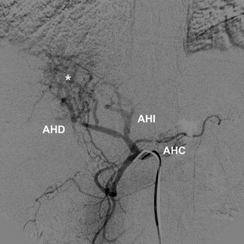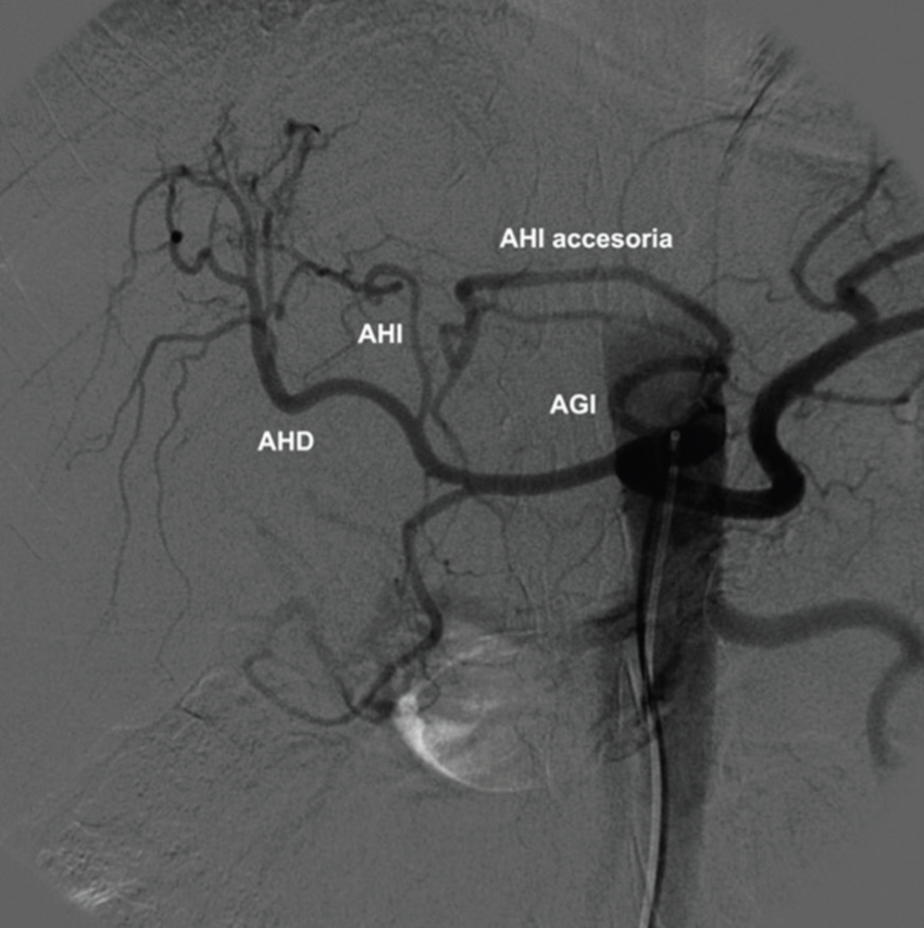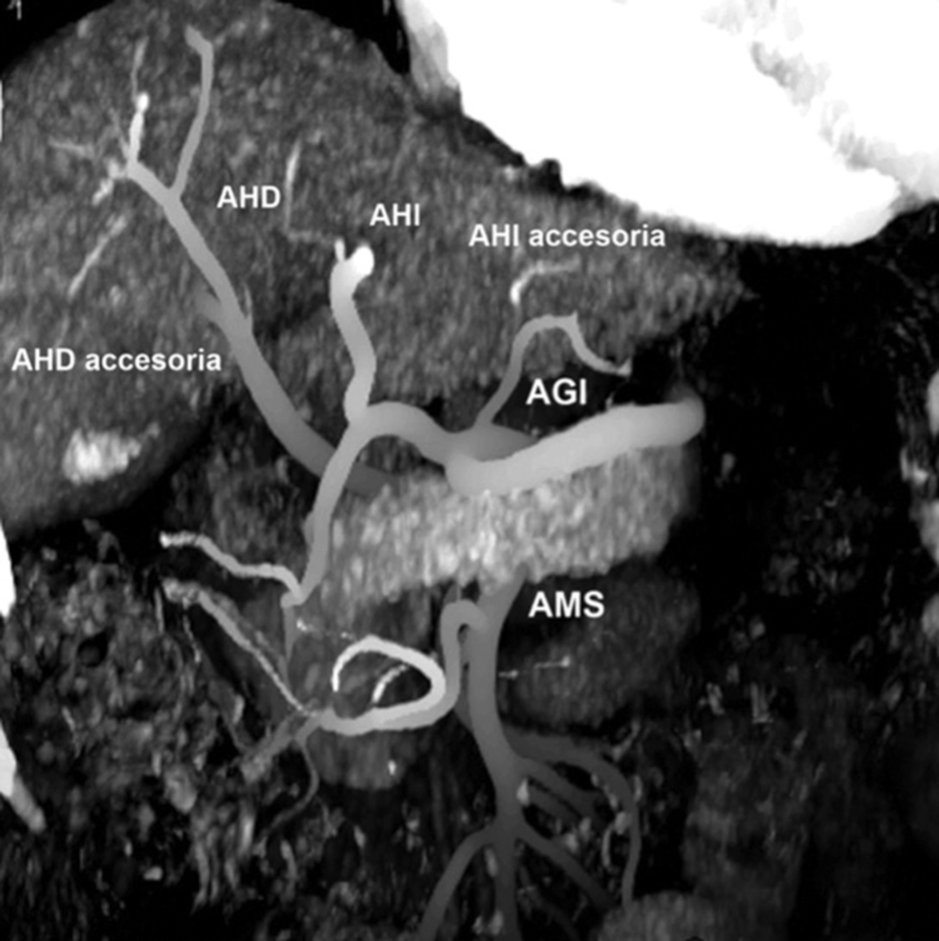 En su origen, la AHC toma contacto con el borde superior del páncreas, luego cruza el pilar derecho del diafragma, se sitúa en el piso del vestíbulo de la bolsa omental cubierta por peritoneo parietal10 y posteriormente, en el foramen epiploico, se divide en la arteria gastroduodenal (AGD) y la arteria hepática propia (AHP) (11. La AGD irriga principalmente la cabeza del páncreas y el duodeno, y se anastomosa con la AMS a través de los arcos pancreático-duodenales anterior y posterior. Asimismo, puede dar origen a la arteria gástrica derecha (10%), la arteria supraduodenal (27%) y la arteria cística (1%)12. En general, la arteria gástrica derecha se origina de la AHP, pero este origen es muy variable y puede nacer de la terminación de la AHC o de sus ramas10.