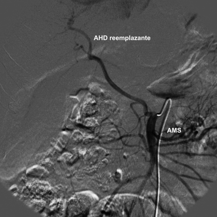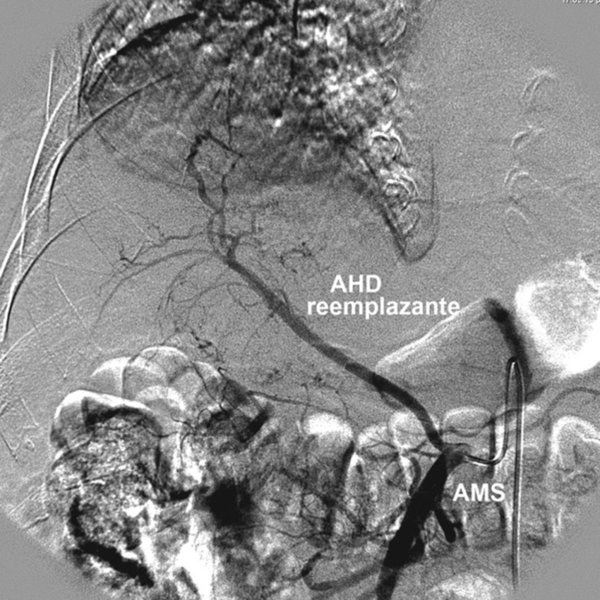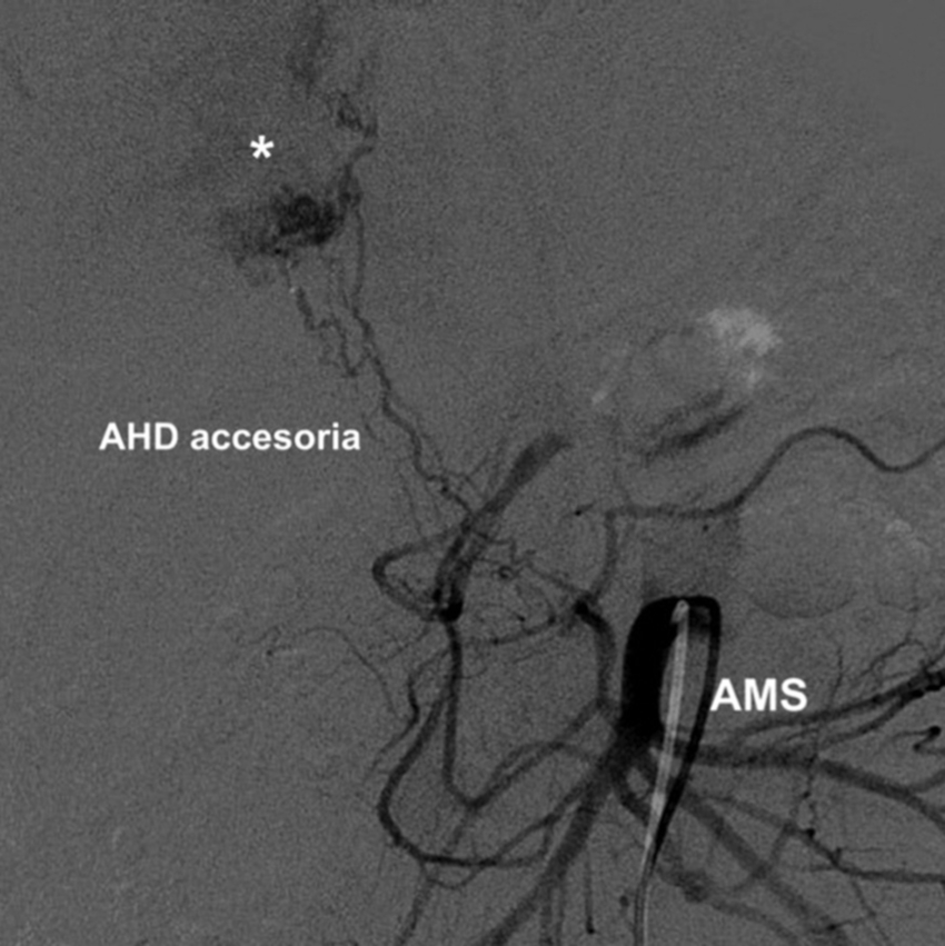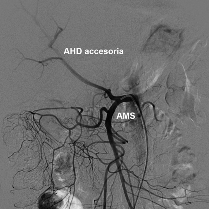 La AMS se origina de la cara anterior de la aorta abdominal, a 2 cm, por término medio, por debajo del tronco celíaco, e irriga el yeyuno-íleon, el duodeno, el páncreas y el colon derecho10. Es relativamente frecuente observar que la AHC, la AHD aberrante o la AHD accesoria se originan de la AMS13.