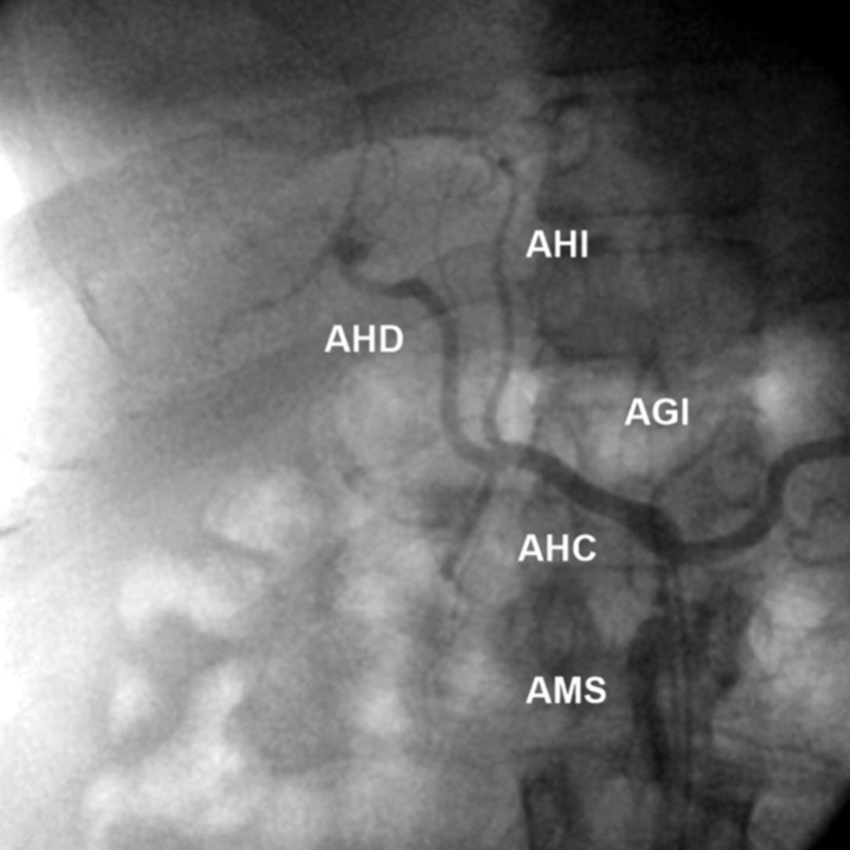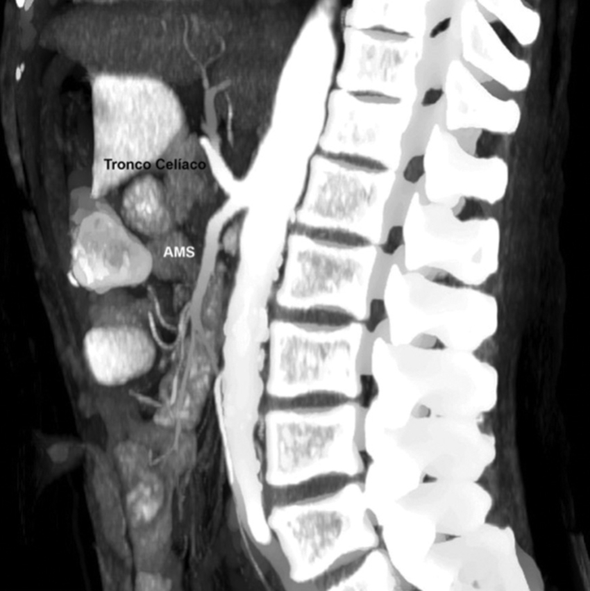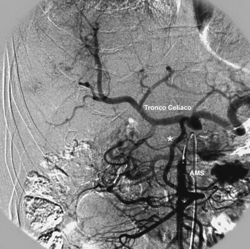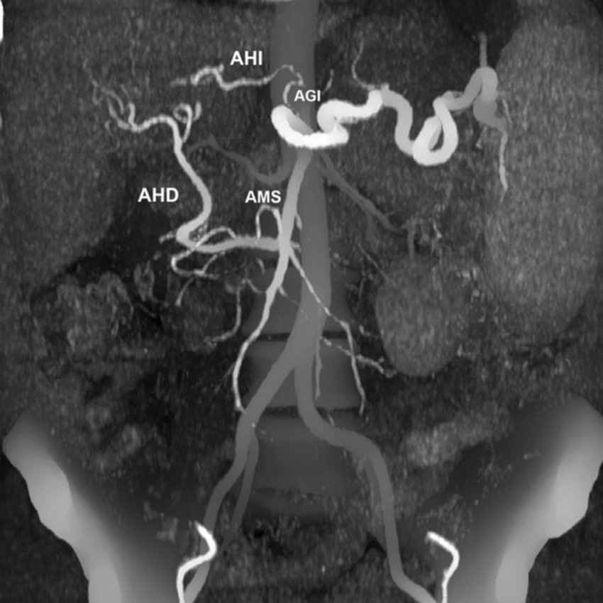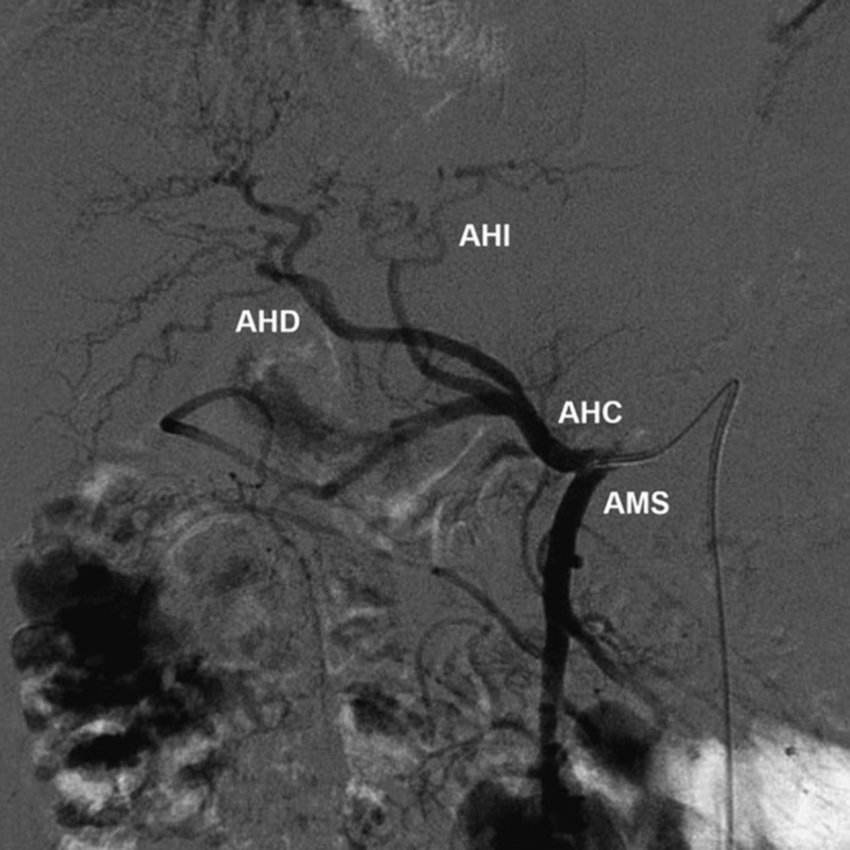 La AMS se origina de la cara anterior de la aorta abdominal, a 2 cm, por término medio, por debajo del tronco celíaco, e irriga el yeyuno-íleon, el duodeno, el páncreas y el colon derecho10. Es relativamente frecuente observar que la AHC, la AHD aberrante o la AHD accesoria se originan de la AMS13.