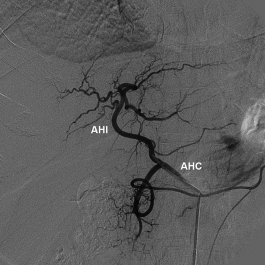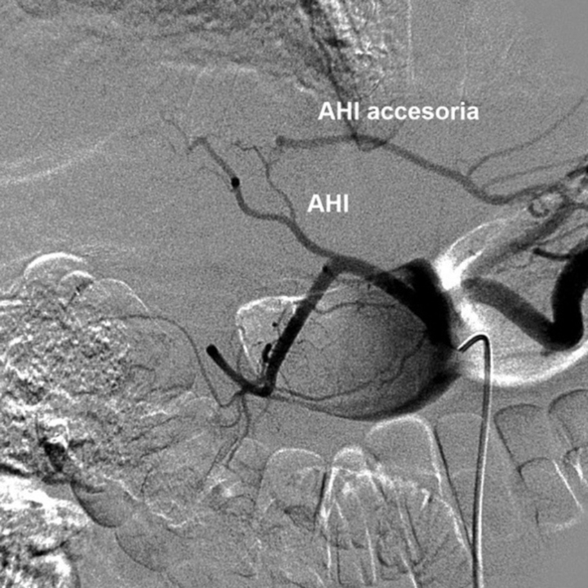 Tipo 7: AHD y AHI con origen en la AHC. AHD accesoria desde la AMS y AHI accesoria desde la AGI (Figs. 13 y 14).