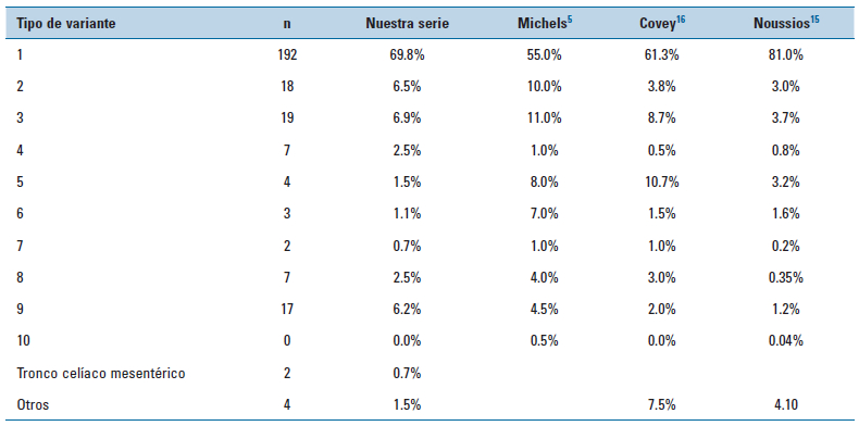 Las siguientes variantes más frecuentes halladas fueron los tipos 2, 3 y 9. Las prevalencias de los tipos 2 y 3 fueron cercanas a la reportada por Fonseca-Neto et al. (18; asimismo, destacamos la prevalencia aumentada de la variante de Michels tipo 9 en nuestra serie comparada con otras publicaciones5,13,15,17,19. Al igual que Covey et al. (16, no hemos detectado la variante de Michels tipo 10; sin embargo, observamos otros hallazgos infrecuentes fuera de la clasificación de Michels, como dos casos de tronco celíaco-mesentérico (0.7%), ausencia del tronco celíaco (emergencia independiente de la AHC y esplénica), AHI accesoria emergente de la AGD y la emergencia de las AHD e AHI aberrantes de la AMS. También hallamos tres casos con arco de Bühler (1.1%), con una frecuencia similar a la de otros reportes (1.0 a 4.0%)20.