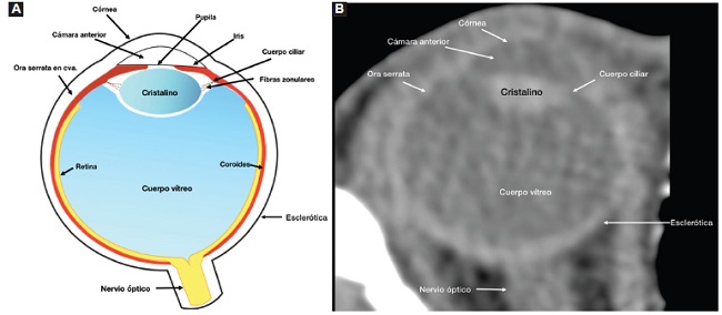 El cristalino es biconvexo y se conecta a la esclera por las fibras zonulares que están orientadas radialmente, dividiendo el globo ocular en segmento anterior que contiene el humor acuoso y el posterior que contiene el humor o cuerpo vítreo. El iris subdivide el segmento anterior en cámara anterior y posterior. Sin embargo, la cámara posterior no se visualiza en las imágenes debido a su pequeño tamaño. La irrigación arterial se da principalmente por la arteria oftálmica. que es rama de la arteria carótida interna, y sus principales ramas son la arteria central de la retina y las arterias ciliares posteriores. El drenaje venoso mayor ocurre por la vena oftálmica superior5.