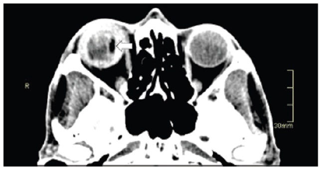 Ocurre por disrupción de los vasos retinianos, lo cual genera sangrado en el humor vítreo. La hemorragia vítrea se ve en la TC como material hiperatenuante en el segmento posterior1,5,6 (Figs. 6 y 7).