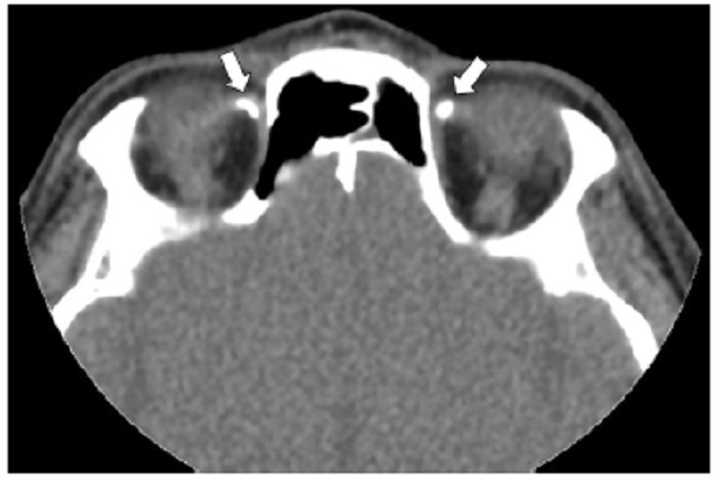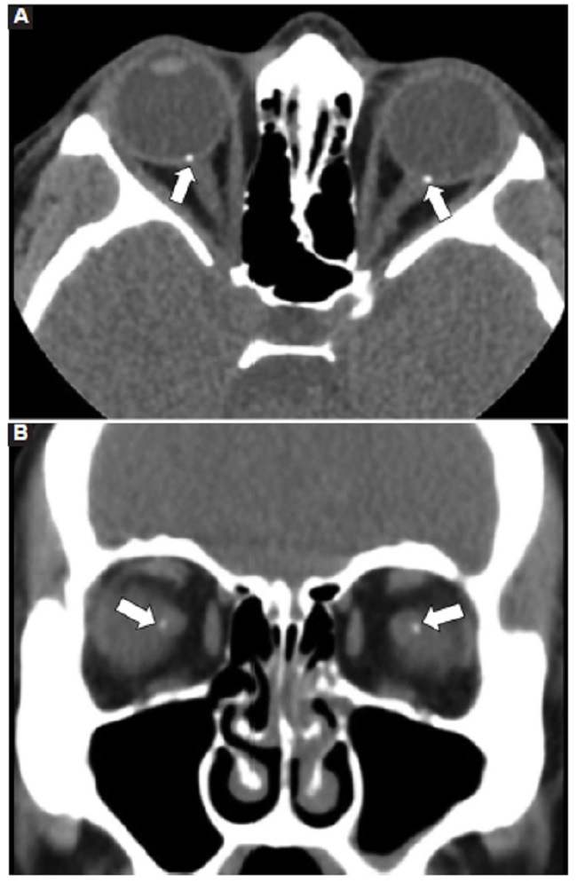 Las calcificaciones oculares y el material médico se pueden confundir con cuerpos extraños u otras lesiones orbitarias1. Las localizaciones típicas de las calcificaciones permiten diferenciarlas de cuerpos extraños hiperdensos. Las más frecuentes son las calcificaciones trocleares, las placas esclerales, las drusas del nervio óptico y la ptisis bulbi. Las primeras tienen localización superomedial dentro de la órbita (Fig. 13), en la tróclea del músculo oblicuo superior, aunque se pueden observar en todas las edades, hay mayor prevalencia de calcificaciones trocleares en pacientes con enfermedades autoinmunes y niveles elevados de fosfatasas alcalinas. Las placas esclerales se localizan en los sitios de inserción de los músculos rectos medial y lateral (Fig. 14) y son más comunes en los pacientes ancianos. Las calcificaciones que ocurren cerca del disco óptico se conocen como drusas del nervio óptico (Fig. 15), las cuales se asocian a degeneración macular y pueden ser causa de pseudopapiledema benigno. La ptisis bulbi es una atrofia y calcificación del globo ocular como secuela de enfermedades infecciosas, inflamatorias o traumáticas previas (Fig. 16) (1,11. Los imitadores de lesiones abiertas del globo ocular incluyen las deformidades como coloboma, estafiloma y el globo ocular elongado por glaucoma o miopía (Fig. 17). Las masas orbitarias y los hematomas también pueden alterar el contorno del globo ocular y asociarse a calcificaciones o relacionarse con desprendimiento de retina (Fig. 18) (1,6,8,11.