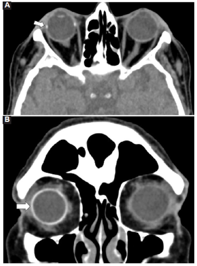La coroides es parte de la capa media del globo ocular y se localiza entre la retina y la esclerótica. Las lesiones traumáticas que generan disminución de la presión intraocular generan acumulación de líquido o sangre en el espacio supracoroideo, que está entre la coroides y la esclera, con subsecuente desprendimiento de la capa coroidea. En la TC el desprendimiento tiene forma lentiforme o biconvexo y respeta la porción posterior del globo que se extiende desde el nivel de las venas del vórtice hasta la ora serrata, hallazgo que lo diferencia del desprendimiento de retina1,6 (Fig. 9).