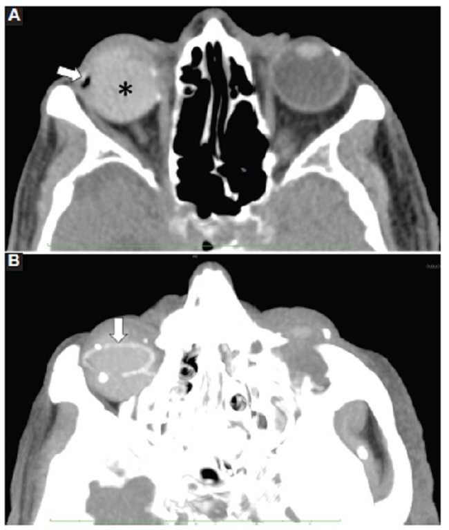 El diagnóstico puede ser obvio al examen clínico, pero en los casos dudosos la TC es el examen de elección, con sensibilidad del 56 al 68% en la detección de roturas ocultas al examen físico1,6,9. Yuan et al. (9 reportaron que la TC en el diagnóstico de rotura del globo ocular tiene sensibilidad promedio del 76% y especificidad promedio del 85%. Gad et al. (9 reportaron que la TC tiene sensibilidad del 87% y especificidad del 97,33% para la detección de perforación anterior del globo ocular7.