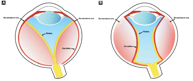 La retina está normalmente adherida a la ora serrata anteriormente y al disco óptico posteriormente. Las lesiones traumáticas de la retina permiten que líquido y sangre se acumulen entre ella y la coroides, generando el desprendimiento de retina1,6. En algunas ocasiones el desprendimiento puede ser parcial5. En la TC se describe la apariencia de V característica con un ángulo agudo con el ápice en el disco óptico y las extremidades en la ora serrata (Fig. 8)1,6.