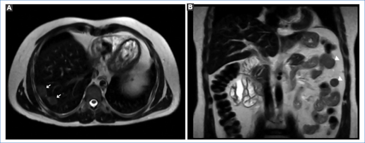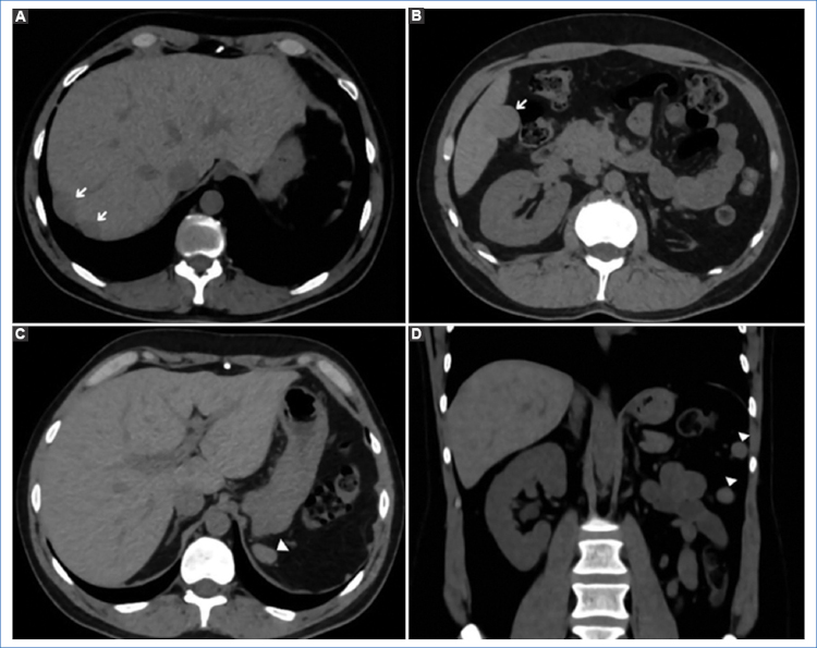 Presentamos el caso de un hombre de 43 años con antecedentes de nefrectomía izquierda y esplenectomía como consecuencia de un trauma cerrado de abdomen por accidente de tránsito, que consulta para caracterización de lesiones hepáticas. Presenta tomografías computadas (TC) previas no contrastadas de control y posteriores a la cirugía, en las que se observaban a nivel peritoneal múltiples imágenes nodulares en el flanco izquierdo y subdiafragmáticas bilaterales; las ubicadas a nivel subdiafragmático derecho se encontraban en íntima relación con la cápsula hepática, cercanas a los segmentos VII y VIII, y persistieron sin cambios en los sucesivos estudios (Fig. 1).