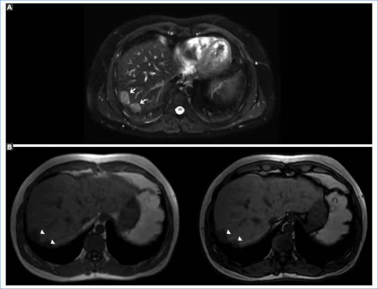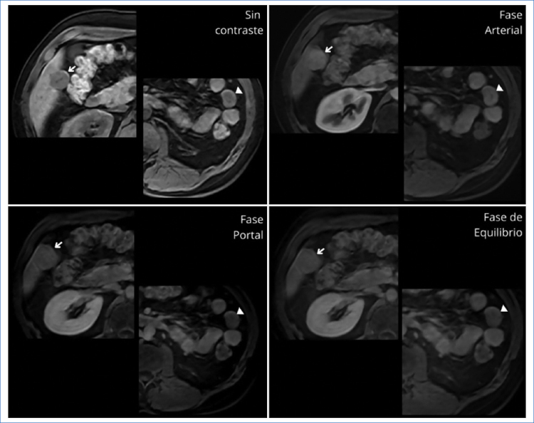 En los estudios de TC multidetector y RM, el tejido esplénico heterotópico tiene la misma apariencia e igual comportamiento que el bazo tras la administración del contraste endovenoso. En la TC sin contraste, la lesión es isodensa con respecto al parénquima hepático y presenta realce en fase arterial, difícil de diferenciar de un adenoma o un hepatocarcinoma4. En la RM, previo a la administración de contraste paramagnético, la lesión es homogéneamente hipointensa en las secuencias ponderadas en T1 e hiperintensas en las ponderadas en T2; después de la administración del gadolinio es hiperintensa en comparación con el resto del parénquima hepático1,5.