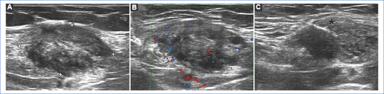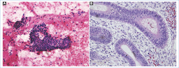 Presentamos el caso de una paciente de 37 años, con antecedentes de cesárea (G1P0C1) dos años atrás, que consulta por una masa palpable no móvil en la pared abdominal anterior, en situación parasagital izquierda, en relación a una cicatriz de cesárea, de un año de evolución. La masa presentaba pequeño tamaño y se asociaba a dolor cíclico que aumentaba durante la menstruación, disminuyendo en los días intermenstruales. No se revelaron otros antecedentes de importancia al momento de la consulta. El médico derivante ordenó una TC abdominopélvica con contraste oral y endovenoso, que demostró la presencia de una imagen nodular con realce luego de la administración de contraste endovenoso en el espesor del músculo recto anterior izquierdo del abdomen, sin compromiso de la cavidad abdominal (Fig. 1). Debido a los hallazgos evidenciados y los antecedentes ginecológicos (cesárea previa y aumento del dolor en el ciclo menstrual), la probabilidad era muy alta para enfermedad endometrial, por lo que se descartó proseguir con otros estudios imagenológicos10 y se solicitó una punción-biopsia guiada por ecografía (Fig. 2). Este procedimiento se llevó a cabo utilizando un transductor lineal de 7.5 MHz (ecógrafo Esaote MyLab Twice) y una aguja Franseen de 20 G. La biopsia, mediante estudio citológico e histológico, confirmó el diagnóstico de endometriosis (Fig. 3).
