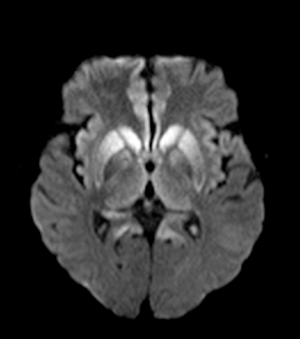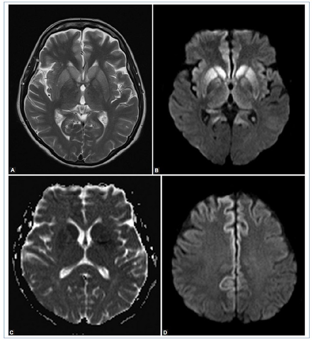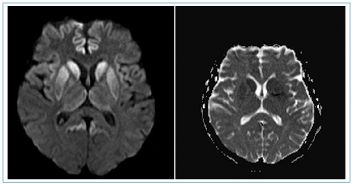 Se llegó al diagnóstico gracias a los hallazgos imagenológicos donde se pueden detallar los signos más comunes encontrados y descritos de la enfermedad en la literatura (hiperintensidad de los núcleos de la base, restricción a la difusión de los núcleos de la base, la corteza frontal y el giro del cíngulo y signo del “palo de hockey”) (Figs. 1,2y3), que junto con la clínica de la paciente y hallazgos en el EEG permitieron realizar el diagnóstico de ECJ.