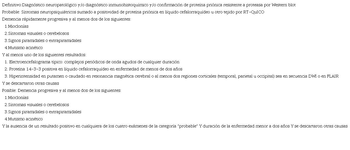 En nuestro caso, los principales criterios diagnósticos fueron: el deterioro neurológico rápidamente progresivo, dos manifestaciones clínicas (mioclonías, compromiso de la vía piramidal), hallazgos típicos del EEG y de la RM cerebral, tratándose entonces de un caso probable de la enfermedad. Dentro de los diagnósticos diferenciales por RM están: enfermedad de Gerst mann-Sträussler-Scheinker2, encefalitis autoinmune, desmielinización osmótica, lesión cerebral hipóxica/ anóxica, encefalopatía hepática, encefalopatía hipoglucémica y enfermedad mitocondrial.
