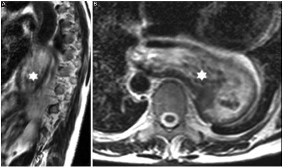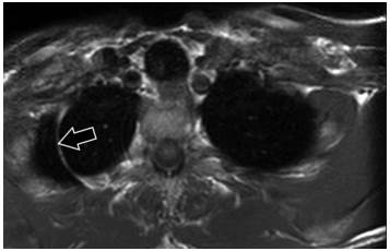 A nivel pulmonar pueden apreciarse nódulos solitarios o consolidaciones. Es importante remarcar que la resolución espacial focalizada en la RM de columna dorsal es pobre en relación con el parénquima pulmonar, cualquier indicio de imagen dudosa deberá estudiarse mediante TC. Las adenopatías mediastinales son frecuentes, solo las mayores de 1 cm o que presenten signos sospechosos deben estudiarse con métodos complementarios. En relación con los grandes vasos, el empleo de una banda de saturación por delante del raquis impide una correcta valoración de la arteria aorta, parcialmente oscurecida. Aunque si se sospecha el aumento de sus diámetros (aneurisma), puede ser incluido en el informe8),(12),(13.