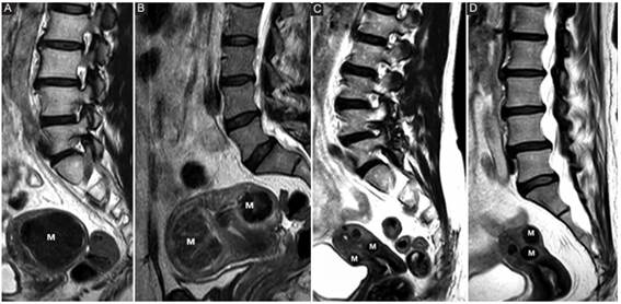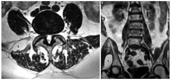 Repasemos los hallazgos extrarraquídeos frecuentes en RM de CL (Tabla 4) (Figs. 14,15,16,17,18,19,20,21,22)7)(8)(9.