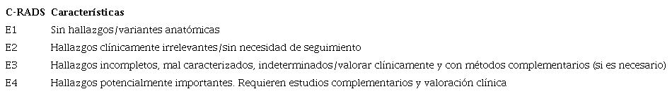 No existe un criterio de uniformidad para clasificar los hallazgos extrarraquídeos mediante RM; algunos trabajos de cohorte emplean la clasificación para hallazgos extracolónicos en la colonoscopia virtual mediante TC, conocido como C-RADS (Colonography Reporting and Data System) (Tabla 1)6),(9)(10)(11, mientras que otros desalientan su implementación7.