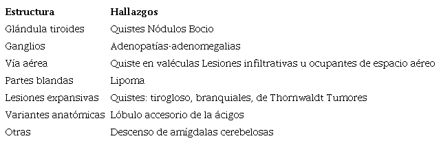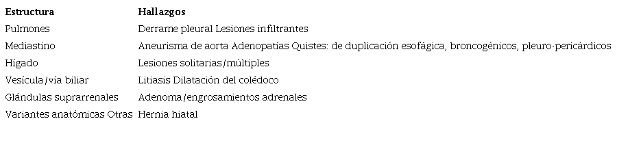 En la tabla 2 se enumeran incidentalomas extrarraquídeos frecuentes en la CC (Figs. 2,3,4,5,6)1),(8.