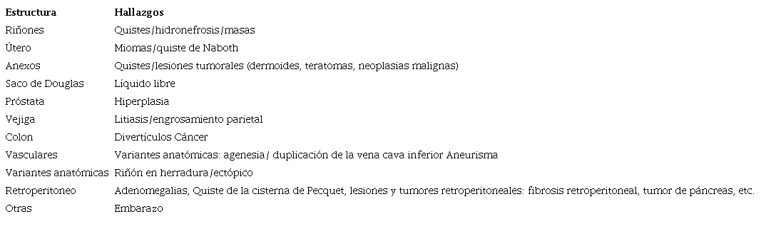 En el 0,2% de las RM lumbares puede visualizarse hidronefrosis, debiéndose sugerir su evaluación etiológica. El aneurisma de la arteria aorta abdominal puede valorarse parcialmente, debido a los artificios por oscurecimiento de las bandas de saturación4),(7),(8.