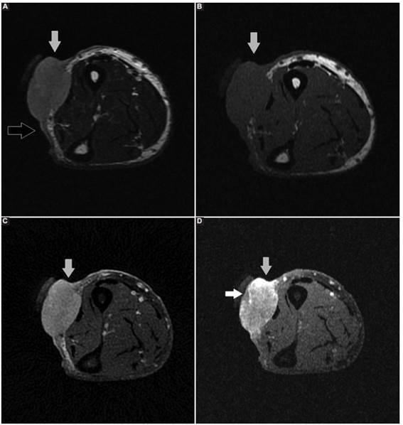 El US y la RM evalúan las lesiones locales, su profundidad y extensión. Ecográficamente, se presenta como un nódulo hipoecogénico, de transmisión acústica variable, con intensa vascularización al Power Doppler. En RM es hipointensa a isointensa en secuencias ponderadas en T1 e isointensa a hiperintensa en secuencias ponderadas en T2/T2-Fat Sat, pudiendo tener un centro hiperintenso en secuencias T2, indicador de necrosis o hemorragia. En secuencias con gadolinio, realza de manera difusa o heterogénea. Muestran un valor de ADC bajo por su alta celularidad1),(4),(9),(10.