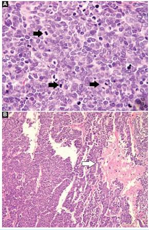 Se realiza exéresis tumoral con bordes ampliados. El estudio histopatológico muestra una neoplasia conformada por células de núcleos basófilos, con escaso citoplasma, frecuentes figuras de mitosis atípicas y áreas de necrosis (Fig. 3). La inmunomarcación fue positiva para marcadores neuroendocrinos y para citoqueratina 20 en patrón dot (“puntillado” paranuclear), consistente con un CCM (tamaño tumoral: 40 x 35 x 21 mm), de márgenes laterales y profundos libres, con invasión linfovascular.