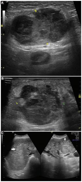 A los dos meses de la cirugía, el paciente consulta por deterioro del estado general con nódulos indurados en la región dorsal, brazo y axila izquierda, que ecográficamente se presumían secundarias (Fig. 4 A y B). Se complementa con ecografía abdominal, observándose numerosas lesiones de aspecto secundarias hepáticas (Fig. 4C). El centellograma óseo corporal con MDP-Tc99m informa foco de hipercaptación en 11a costilla derecha.