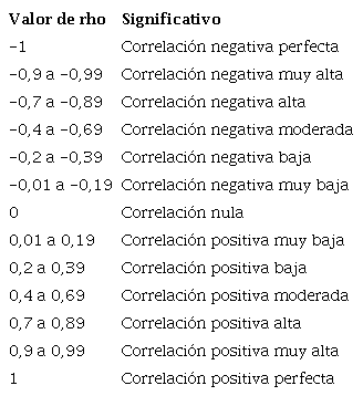 Se estimó la correlación entre variables continuas mediante el test de Spearman. La tabla 1 muestra la interpretación del grado de correlación en rangos, según el valor del coeficiente. El análisis estadístico se realizó mediante el software SPSS versión 21.0. El límite para relevancia estadística se estableció en p = 0,05.
