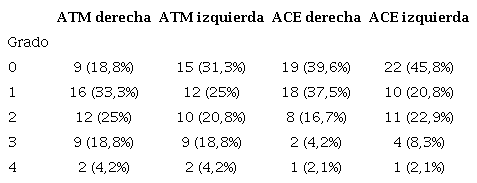 Encontramos una ACE grado 0-1 del lado derecho en el 77% de los pacientes y del lado izquierdo en 67% de los pacientes. El 52% de los pacientes tenía una ATM grado 0-1 del lado derecho y el 56% del lado izquierdo.