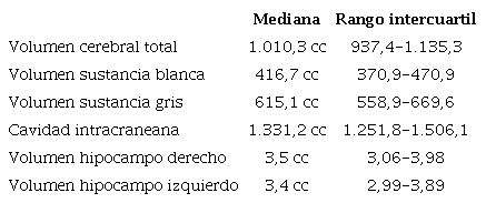 El volumen del hipocampo derecho medido mediante segmentación automática fue de 3,5 cc (RIC: 3,06-3,98) y del lado hipocampo izquierdo fue de 3,4 cc (RIC: 2,99-3,89). Las demás mediciones volumétricas se muestran en la tabla 3.
