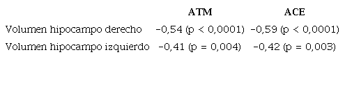 Resultados: Se incluyeron 48 pacientes, 31 eran mujeres (64,6%). Mediana de edad: 76,5 (RIQ: 69-83). La correlación entre las escalas visuales ACE y la ATM del lado derecho fue de 0,67 p < 0,0001) y del lado izquierdo de 0,69 (p < 0,0001). Encontramos correlación negativa moderada entre la ACE y el volumen hipocampal, del lado derecho fue de -0,59 (p < 0,0001) y del lado izquierdo de -0,42 (p = 0,003).